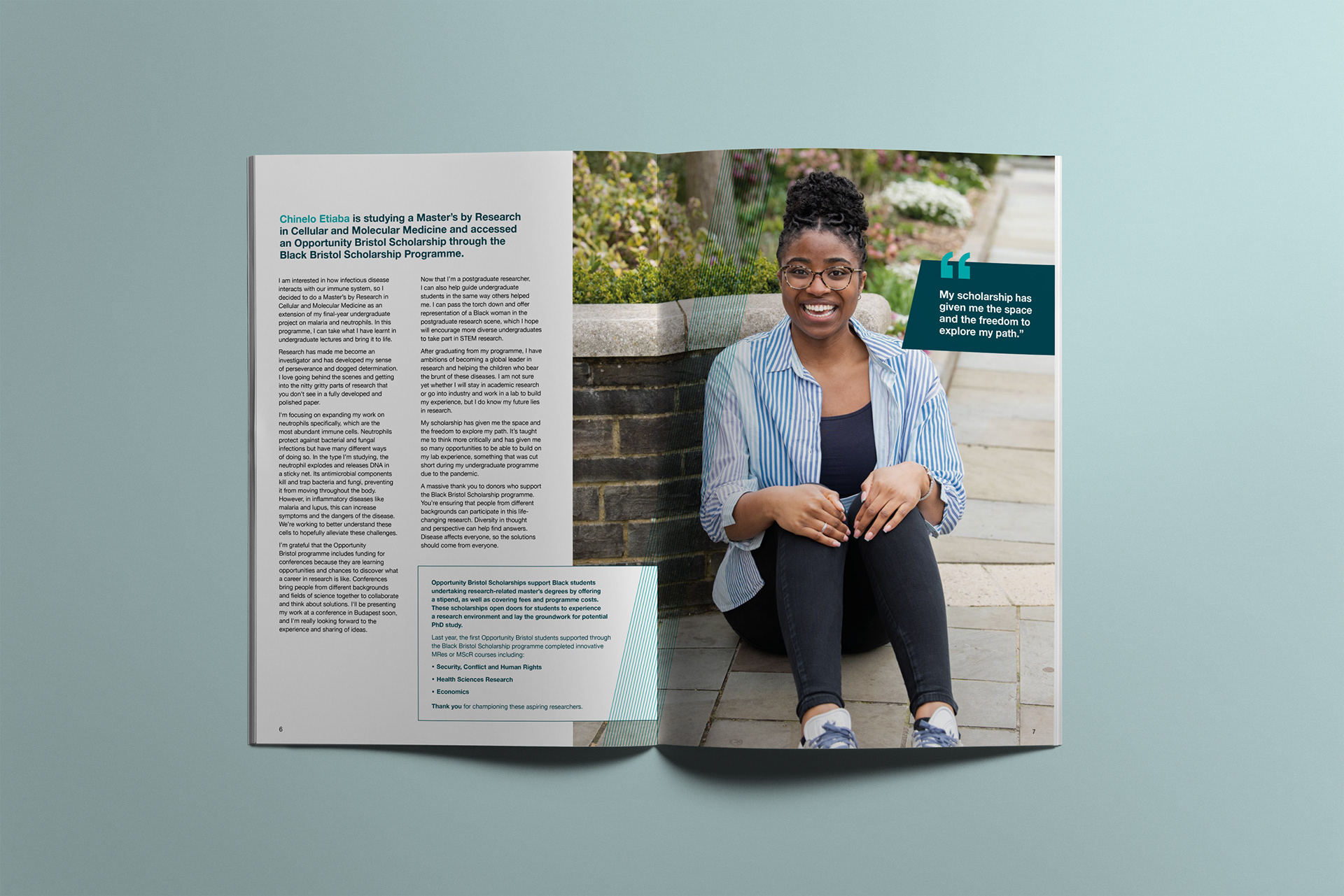 I've been lucky enough to work with the University of Bristol's (UoB) Department of Alumni Relations. For this project I was to design a series of scholarship reports - they had to feel part of the same family but have their own identity. These reports were sent out individuals who had donated to he university to give them an update on how the Scholarships change lives.